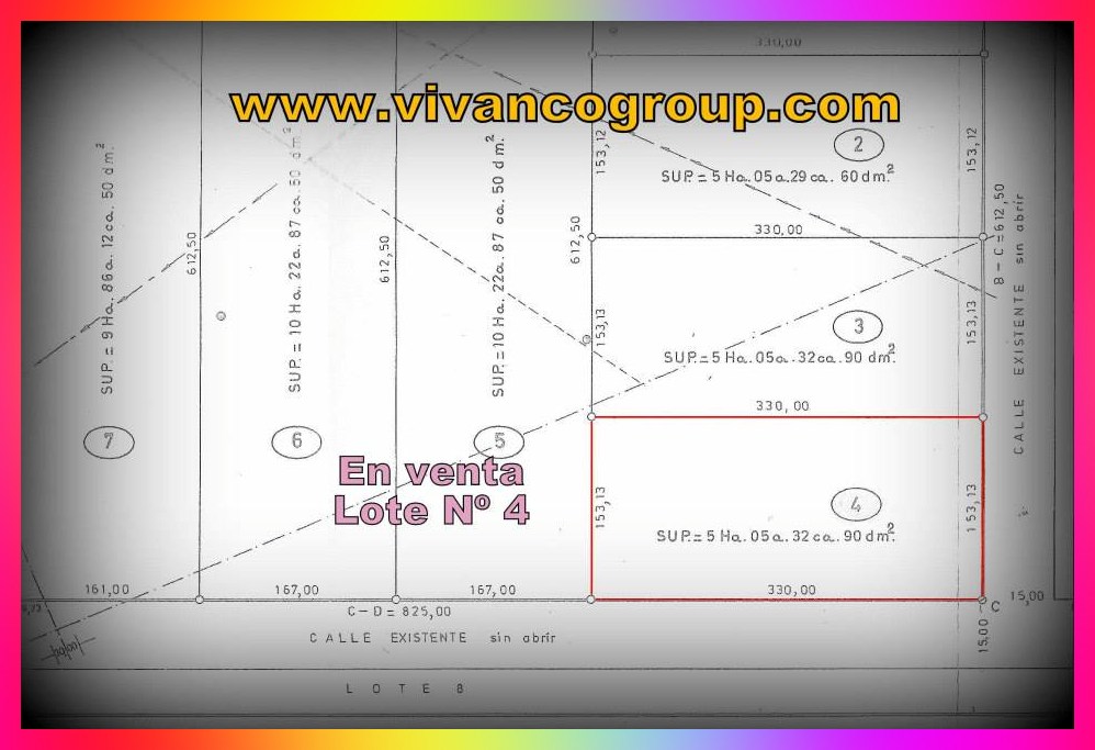 Medidas y Superficie del lote: El lote mide 330 m. de frente por 153 m. de frente, por tratarse de un lote de esquina, teniendo una superficie de 50.000 m2. El terreno se orienta hacia el sud-este y hacia el sud-oeste.