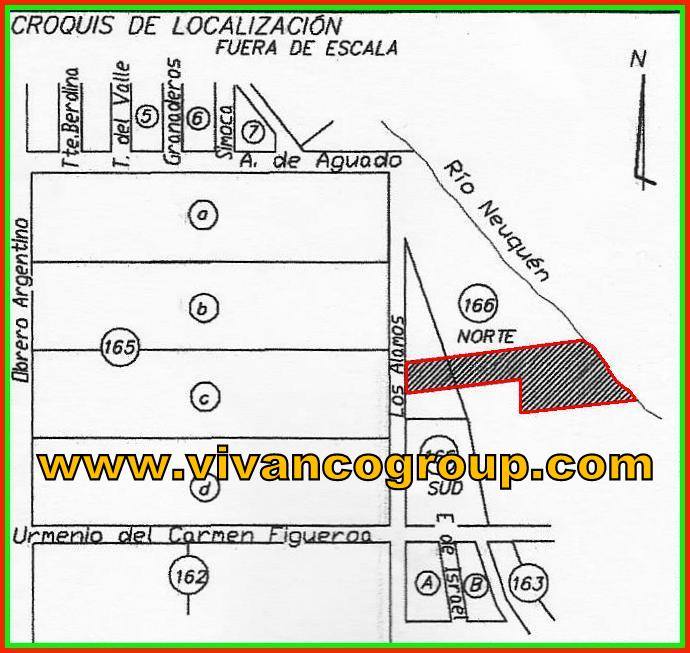 El frente del terreno sobre calle Los Álamos tiene 40 m. y su fondo tiene 160 m. de frente sobre el Río Neuquén.