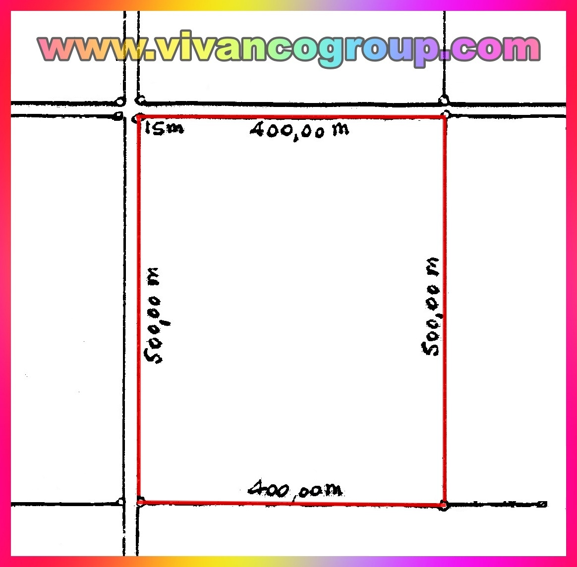 Medidas y Superficie: La Chacra mide 400 m. x 500 m., totalizando una superficie de 200.000 m2., es decir, 20 has.