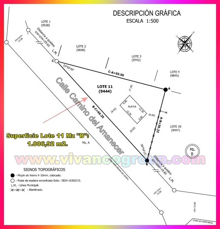 Medidas y superficie del terreno: El terreno mide 66,35 m. de frente sobre calle "Camino del Amanecer" en su frente hacia el Sur, por 36,23 m. en su lado que da hacia el Nor-este, por 55,59 m. en su lado que da hacia el Nor-oeste. La superficie del Lote es de 1.006,92 m2.