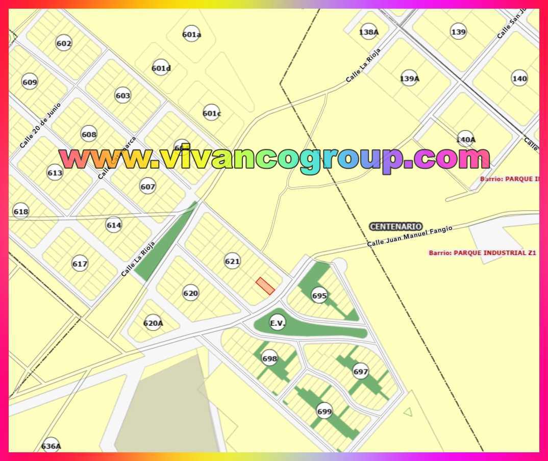Descripción: Se trata de un terreno baldío, sin mejoras y sin construcciones. El frente del terreno da sobre la Av. Juan Manuel Fangio, que es la principal calle de acceso al barrio y que une la Multitrocha de la Ruta Provincial Nº 7 y el Autódromo de Centenario.
