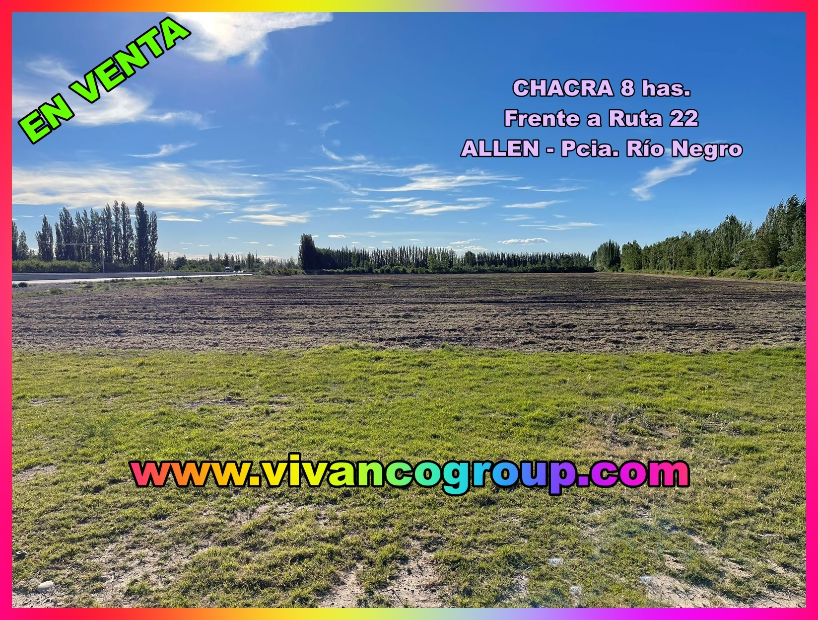 Potencialidad. Esta chacra es ideal para multi-destinos. Es apta para una base de empresa y para logística por tener frente sobre la Ruta Nacional Nº 22, estando también asfaltada la calle Colectora existente entre la chacra y la Multitrocha. También es apta para construir depósitos o galpones para su alquiler o venta.